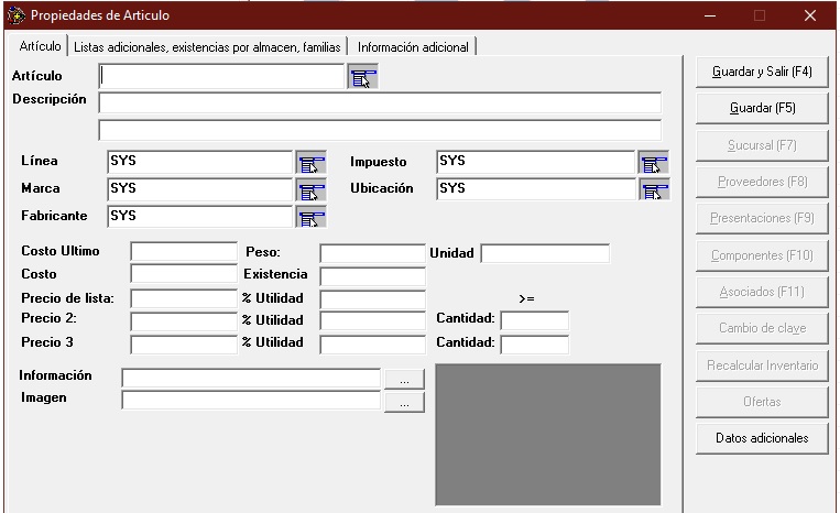 Los datos línea, marca, impuesto y ubicación vienen precargados con la leyenda “SYS” o genéricos. Cámbielos si lo considera necesario. Si estos datos no han sido creados, puede minimizar la ventana actual e ingresarlos dentro del Business Manager para posteriormente regresar a seguir capturando los datos del artículo.